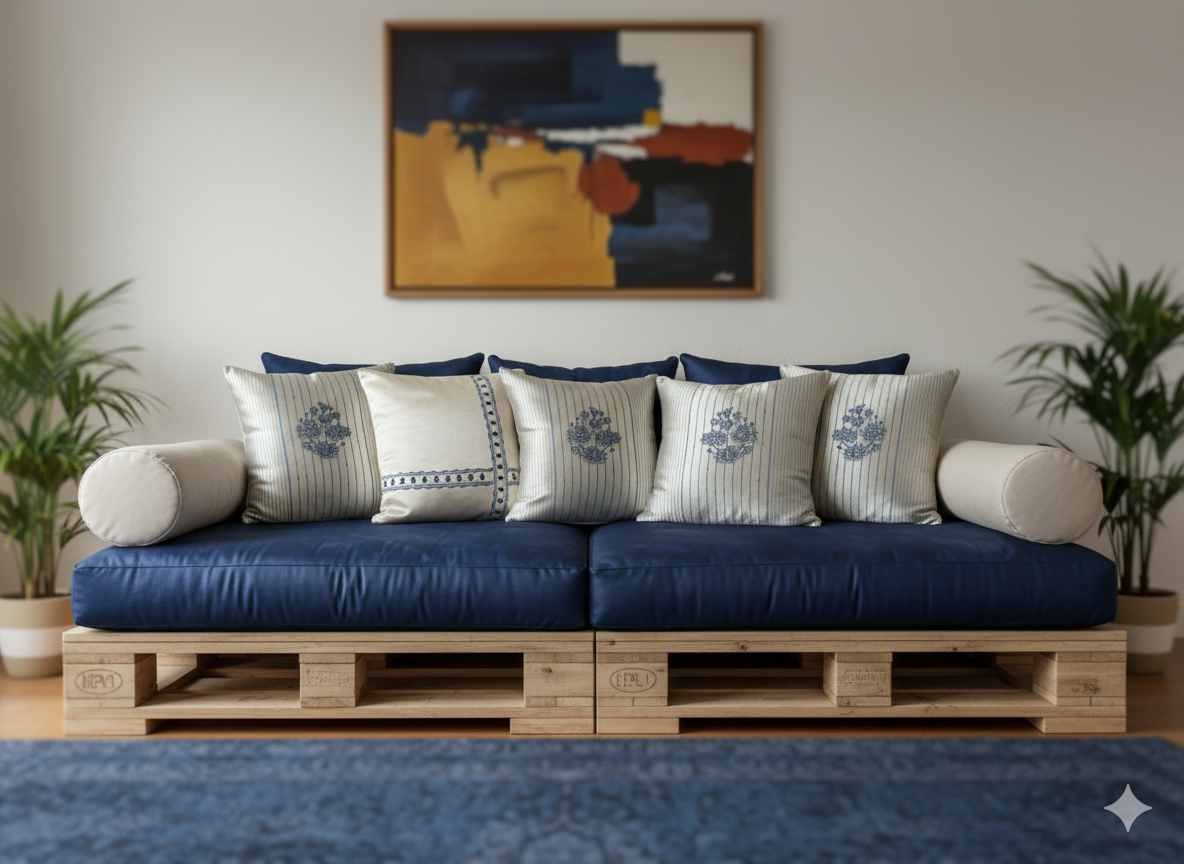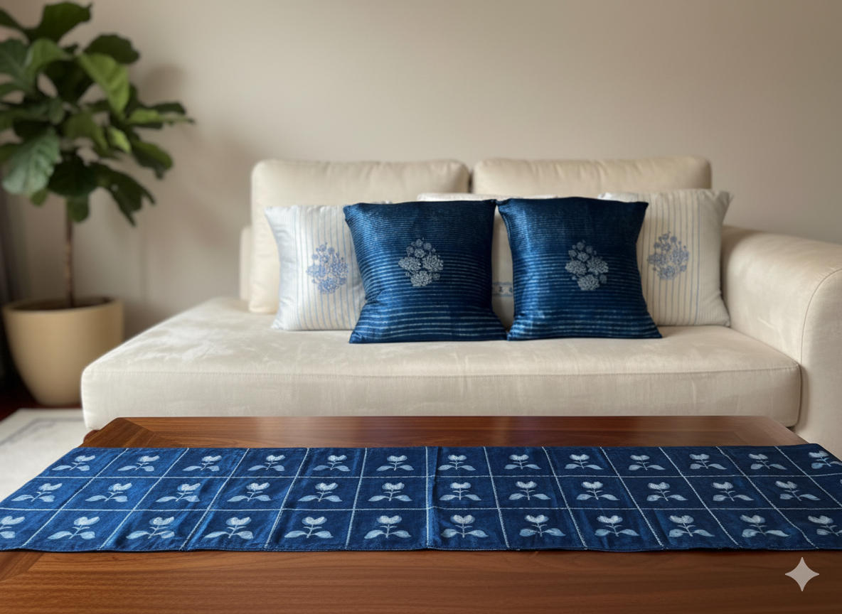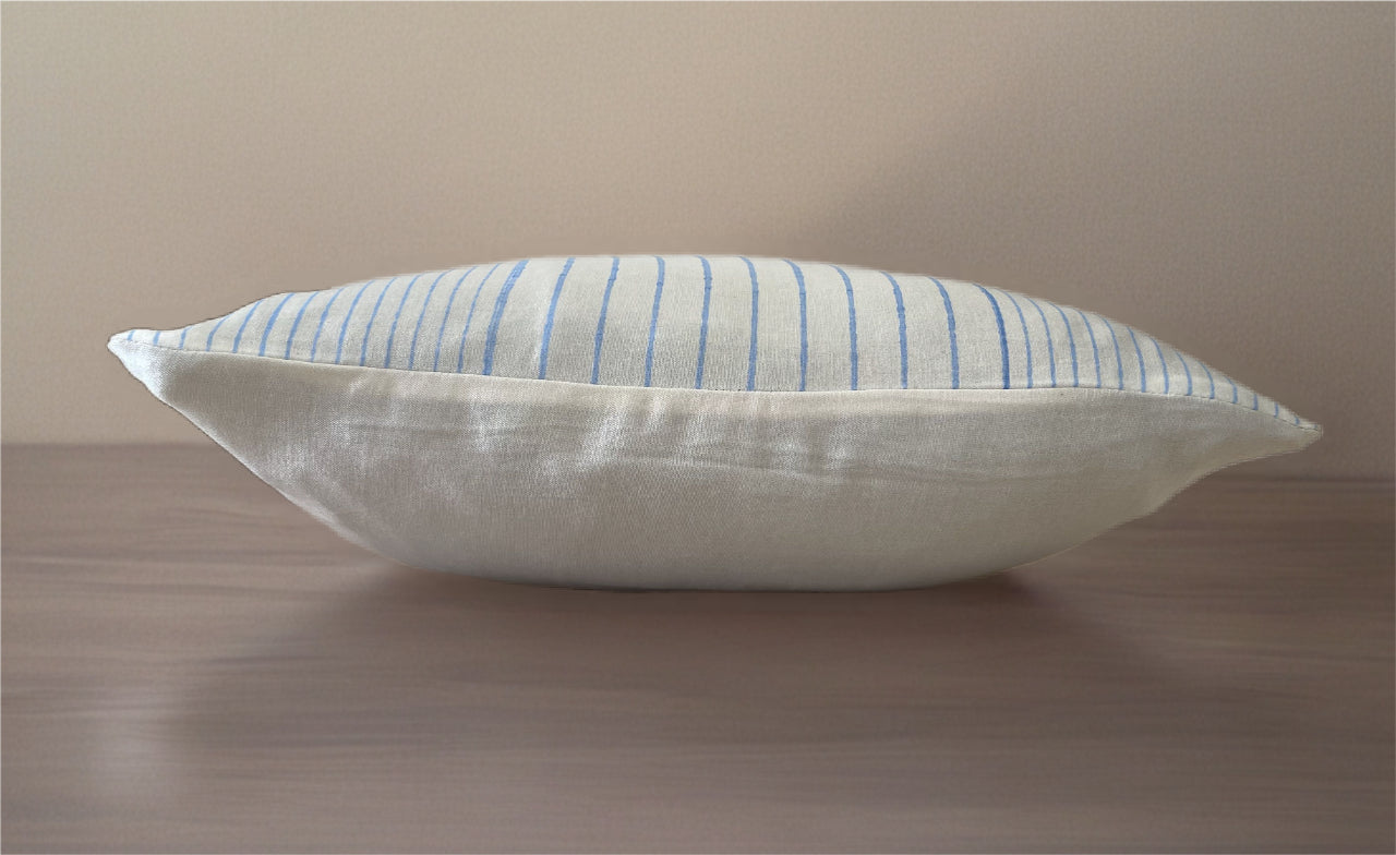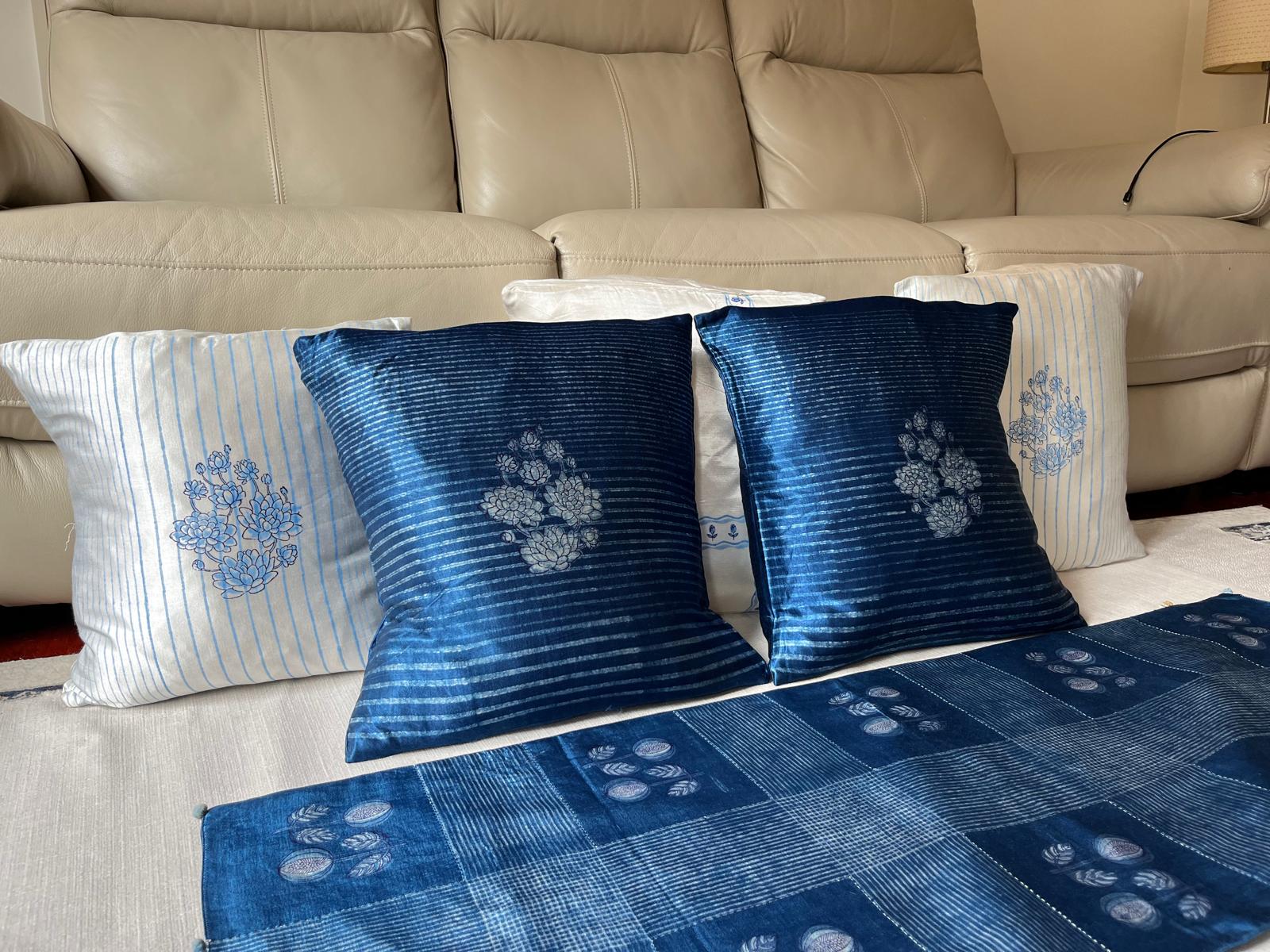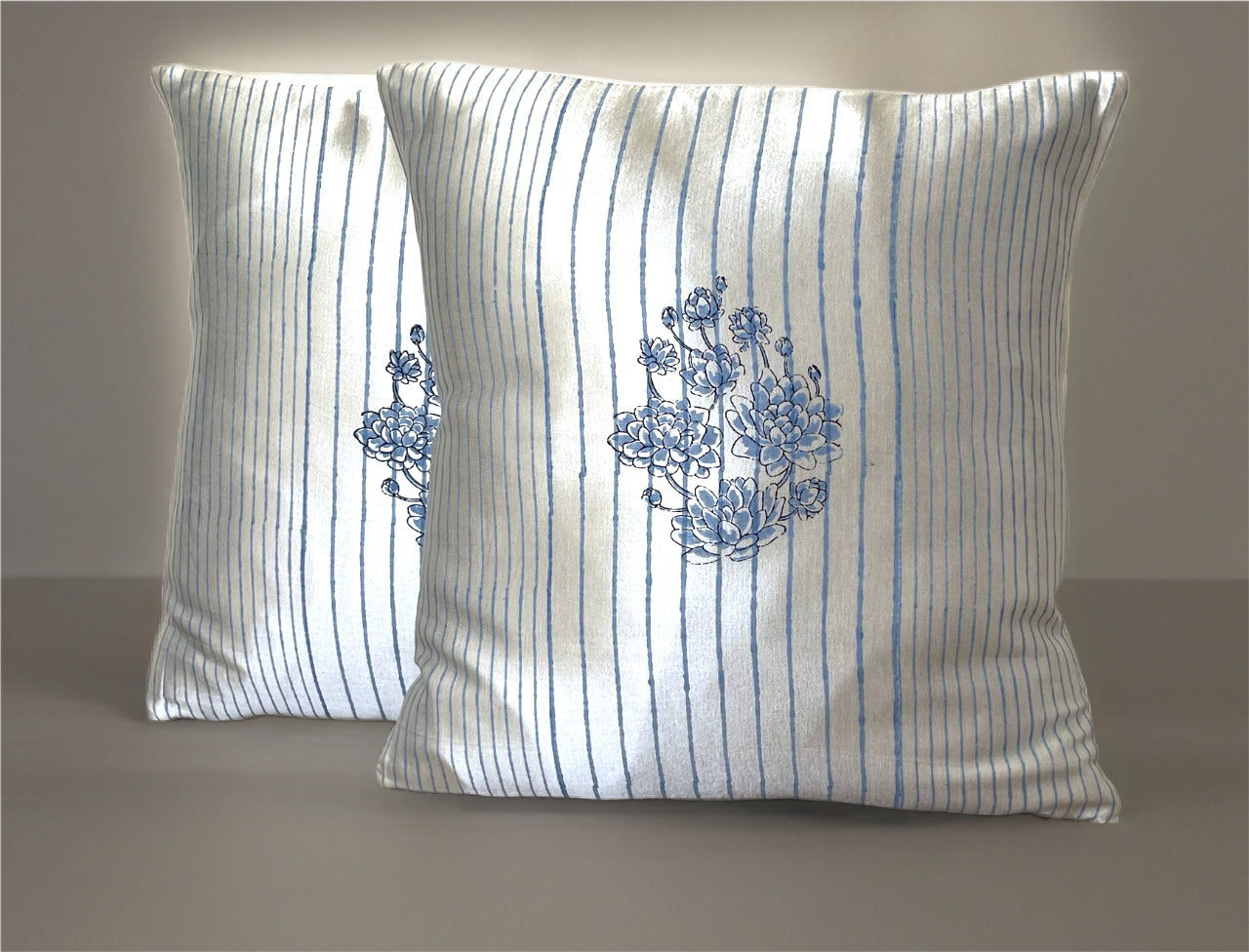 Handcrafted in luminous Mashru silk, this cushion cover features delicate indigo block prints on an ivory base. The interplay of tone, texture, and natural sheen gives each piece a quiet radiance — designed to bring light, balance, and a touch of stillness to your space.