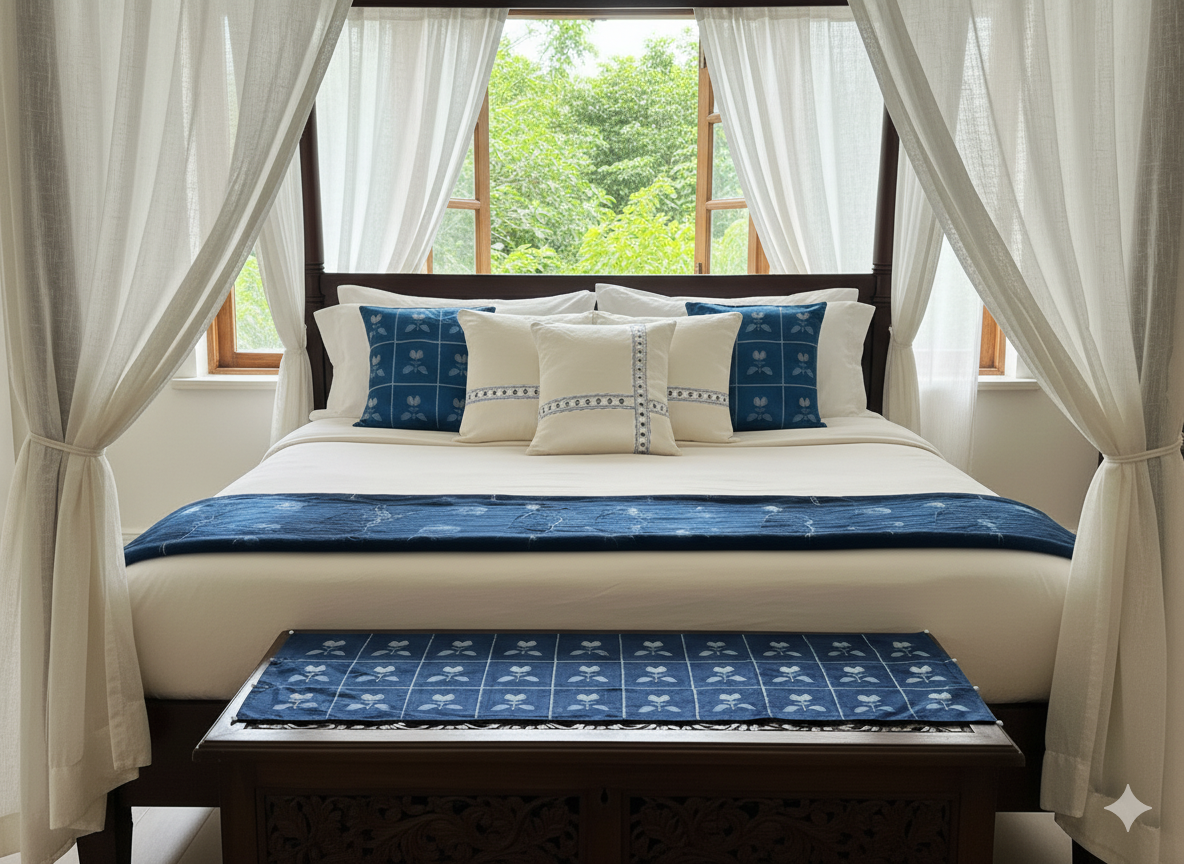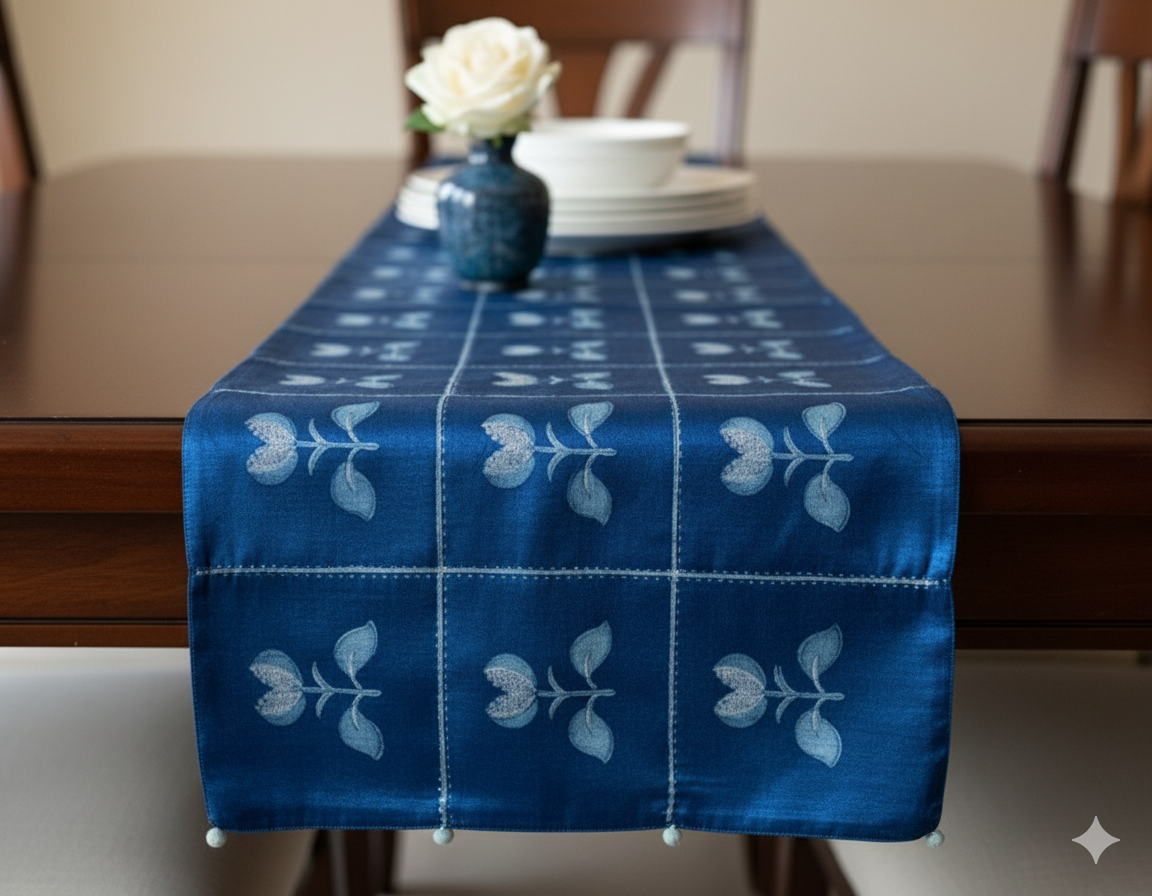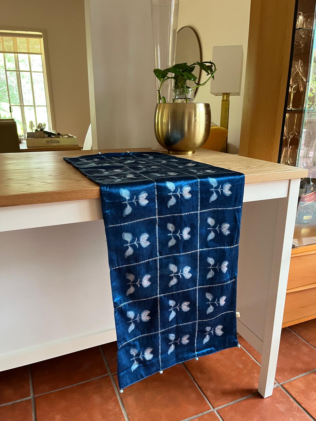 Handcrafted in luminous Mashru silk, the Skybloom runner captures the quiet balance of light and depth. Natural indigo meets soft neutrals through fine block printing. The gentle sheen of the fabric enhances its botanical motifs, adding depth and light to any setting. Subtle variations in tone and print are part of the natural dyeing process, adding character and authenticity to every piece.