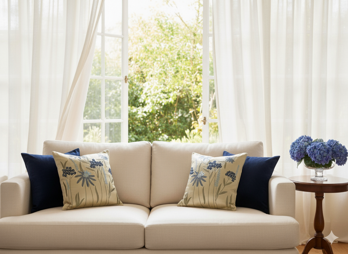 Woven in lustrous Dupioni Silk, this blue and ivory cushion cover brings quiet drama to modern living through the subtle beauty of embroidered florals. Designed to bring depth and softness to your space, it carries the natural sheen and tonal variations that make silk endlessly captivating.