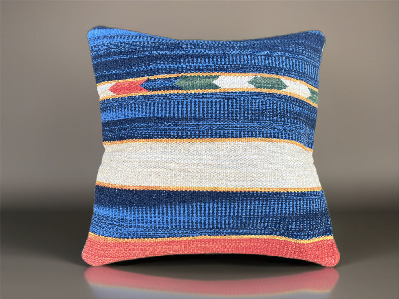 Handwoven on traditional pit looms by Indian craftsmen, this cushion cover celebrates the age-old Kilim tradition in geometric motifs and a richly textured weave.