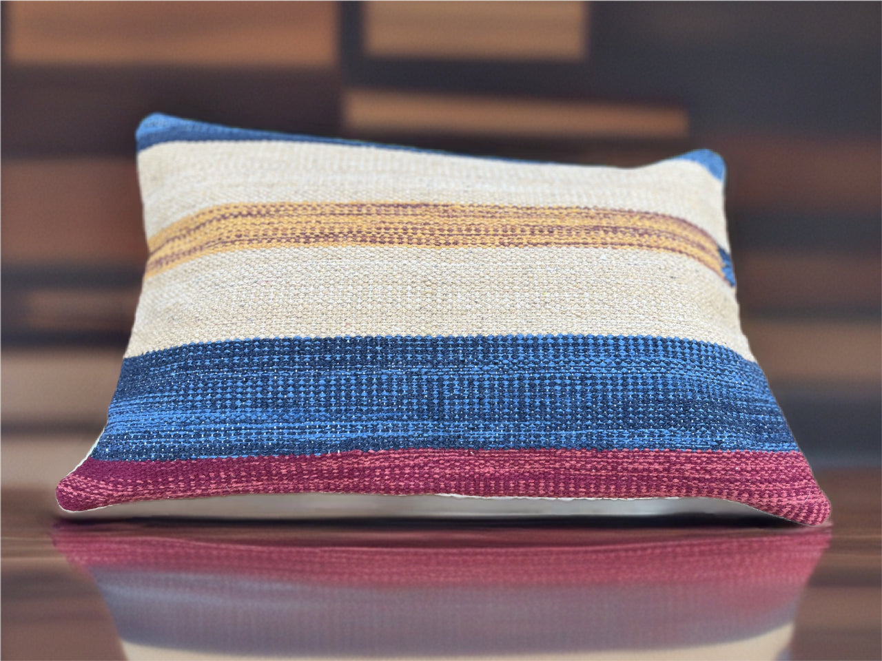 Handwoven on traditional pit looms by Indian craftsmen, this cushion cover celebrates the age-old Kilim tradition in geometric motifs and a richly textured weave.