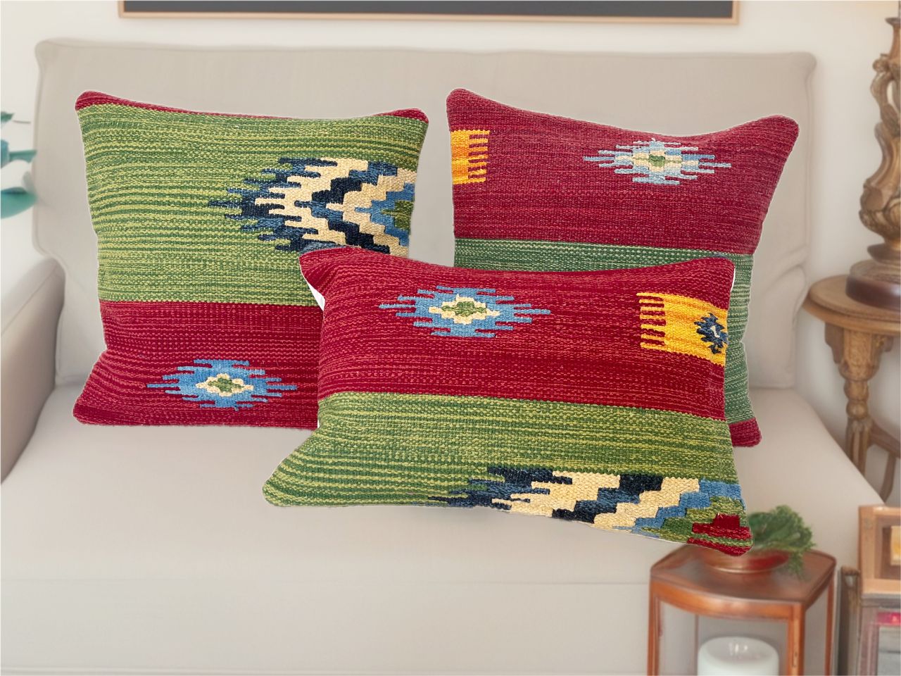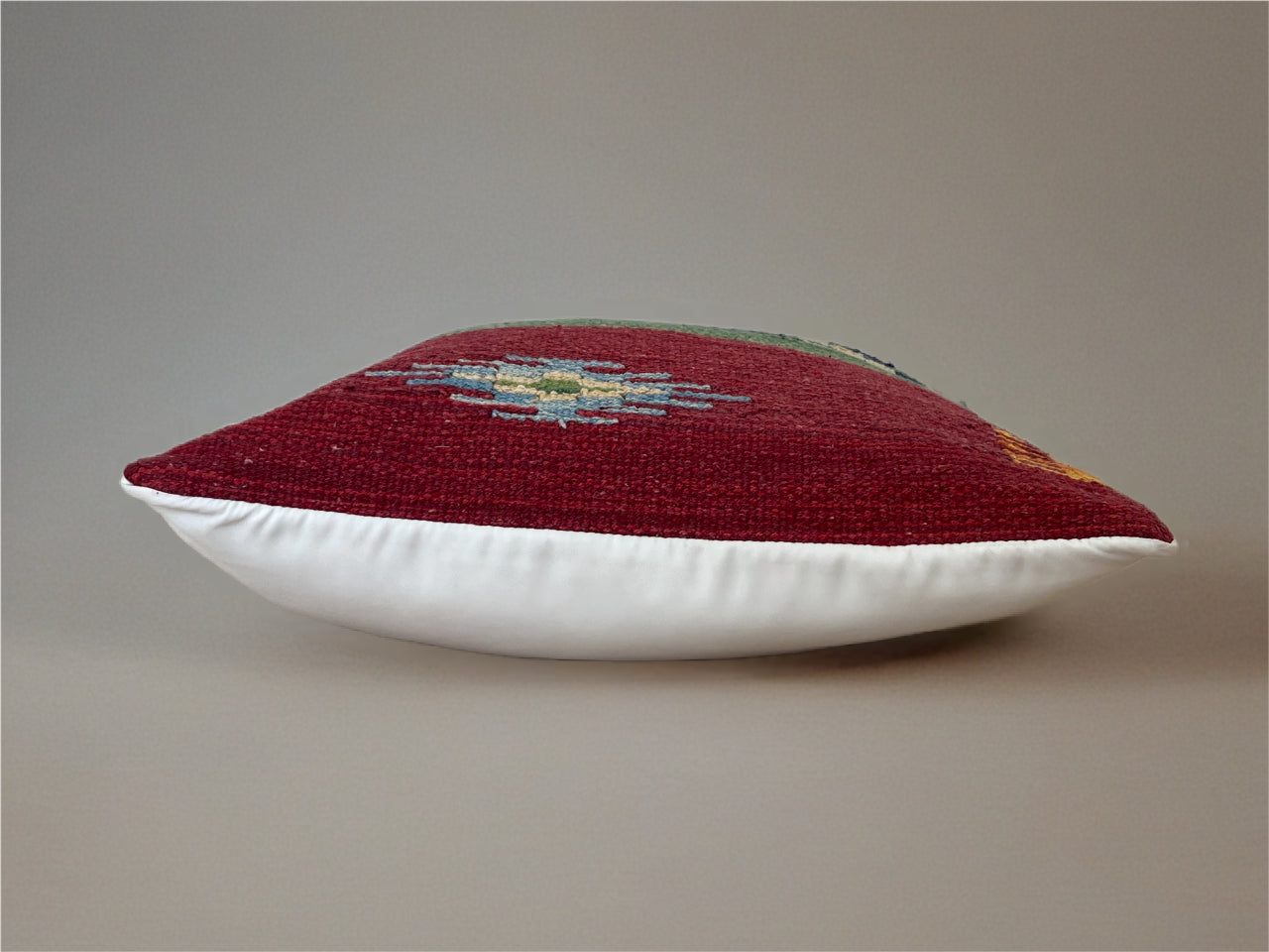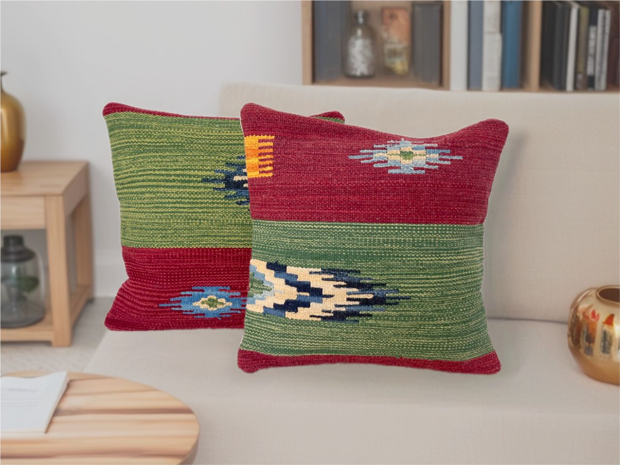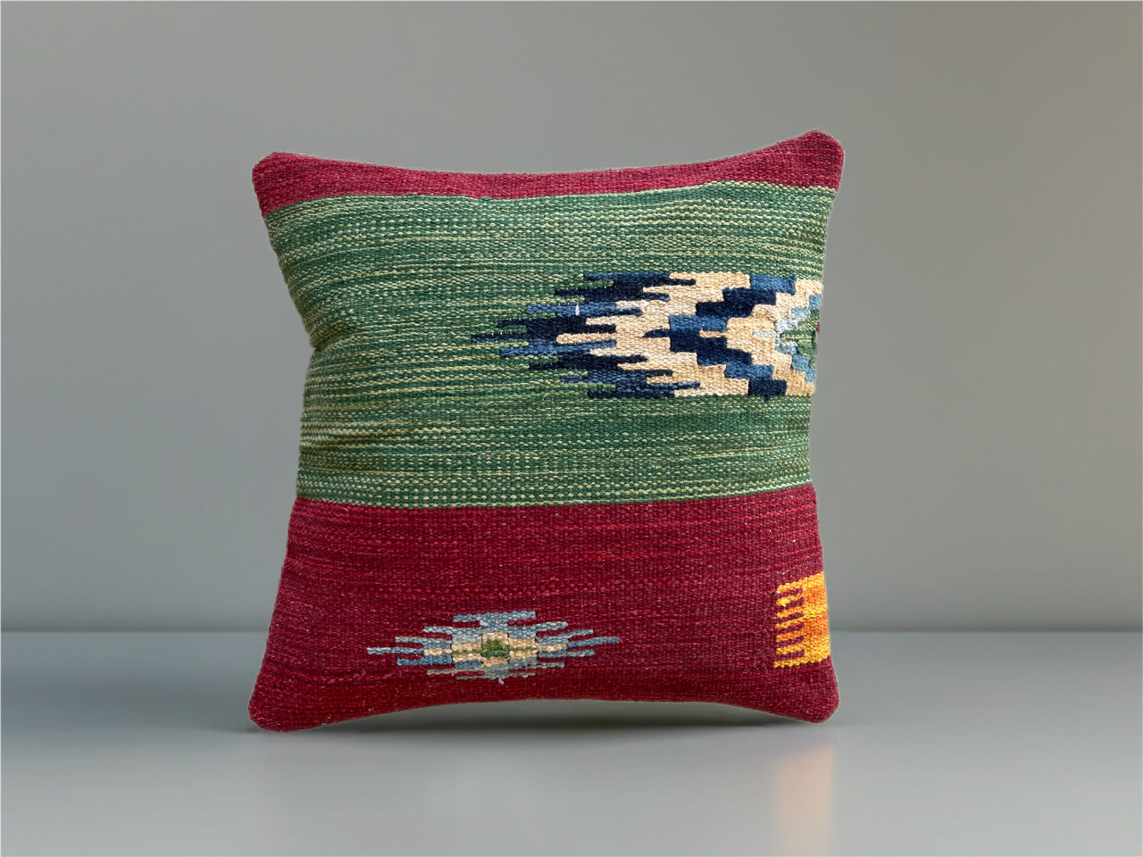 Handwoven on traditional pit looms by Indian craftsmen, this cushion cover celebrates the age-old Kilim tradition in geometric motifs and a richly textured weave.