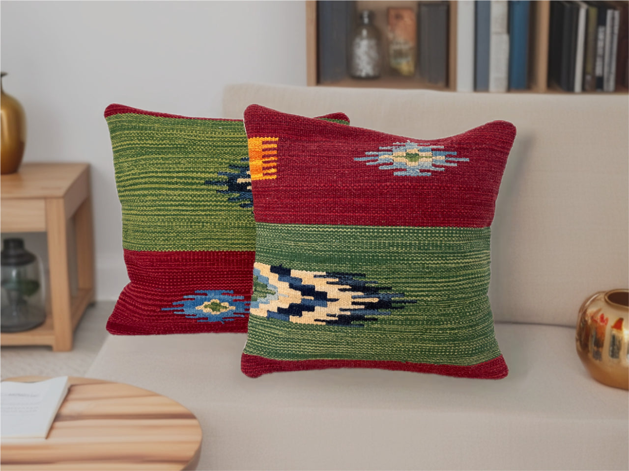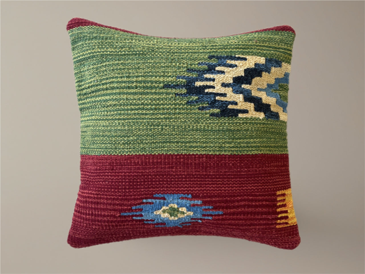 Handwoven on traditional pit looms by Indian craftsmen, this cushion cover celebrates the age-old Kilim tradition in geometric motifs and a richly textured weave. Slight variations in color and design reflect its handmade origin — a signature of craft, not flaw. Designed to energize contemporary interiors with warmth, character, and enduring charm.