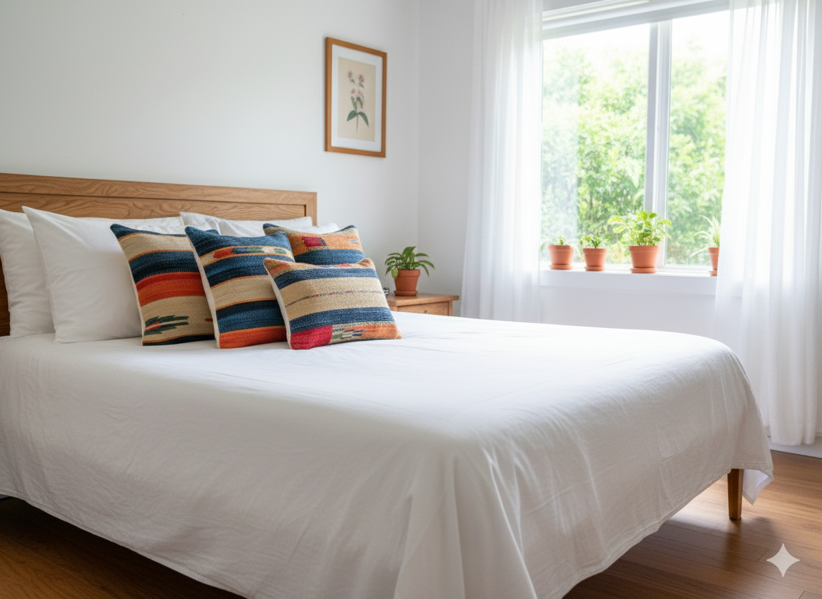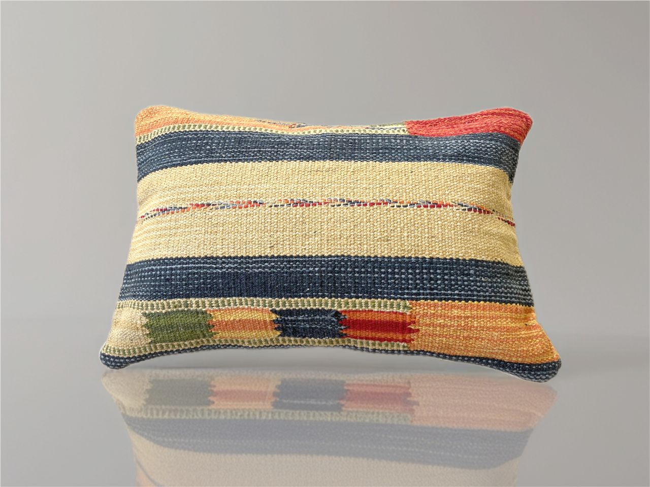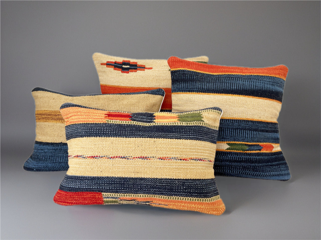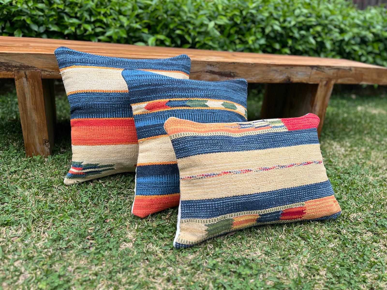 Handwoven on traditional pit looms by Indian craftsmen, this cushion cover celebrates the age-old Kilim tradition in geometric motifs and a richly textured weave. Slight variations in color and design reflect its handmade origin — a signature of craft, not flaw. Designed to energize contemporary interiors with warmth, character, and enduring charm.