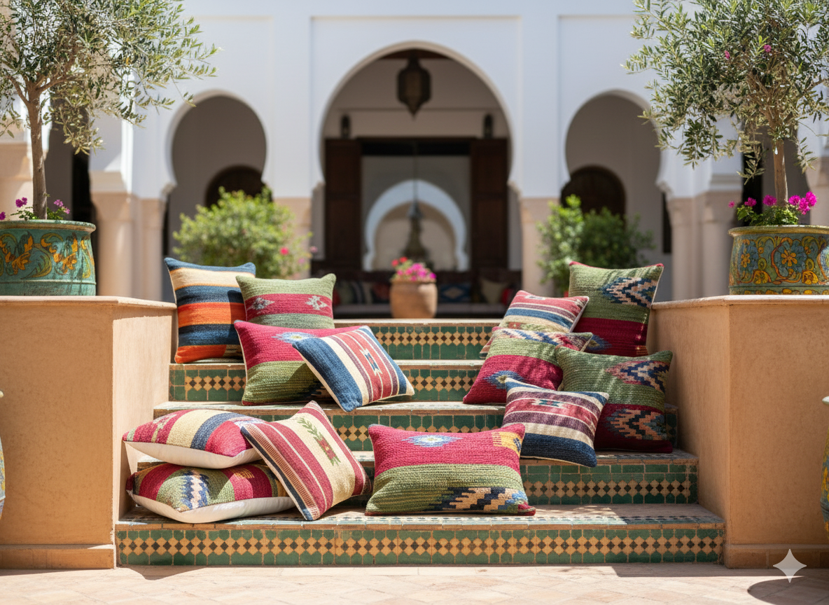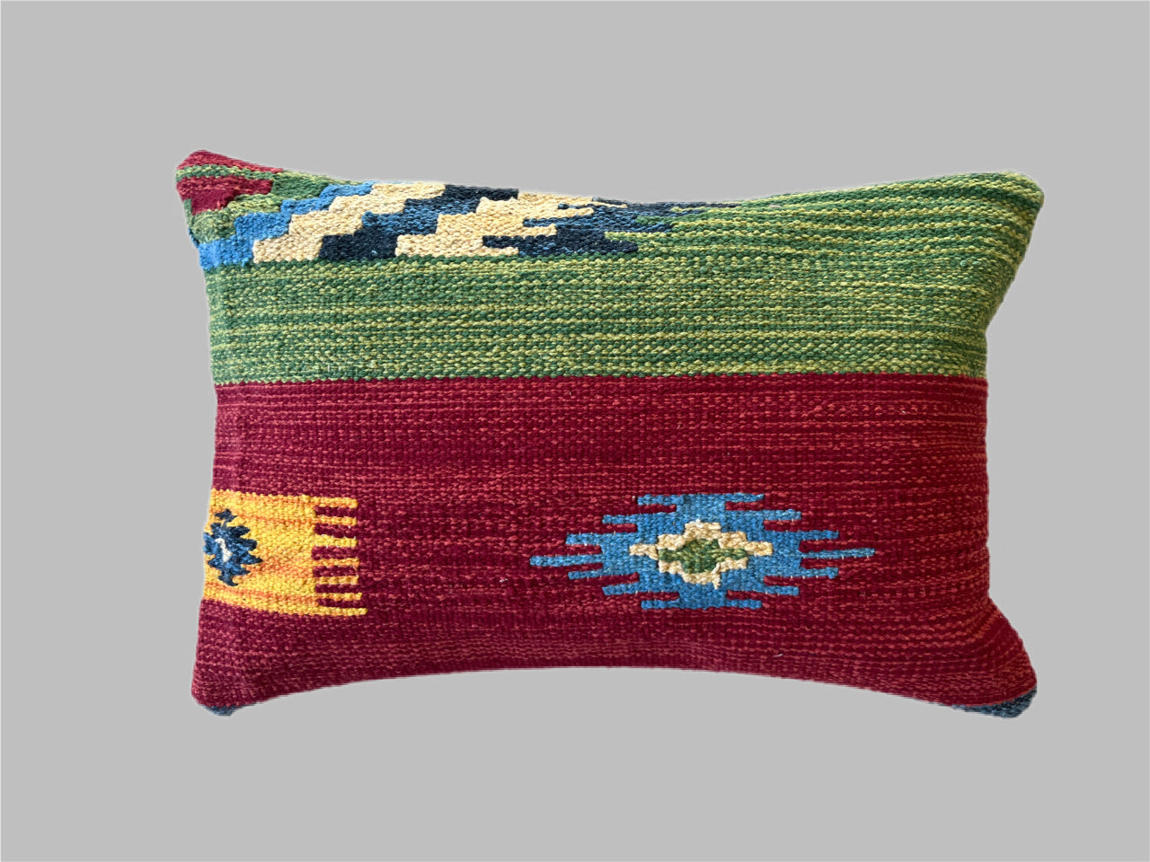 Handwoven on traditional pit looms by Indian craftsmen, this cushion cover celebrates the age-old Kilim tradition in geometric motifs and a richly textured weave. Slight variations in color and design reflect its handmade origin — a signature of craft, not flaw. Designed to energize contemporary interiors with warmth, character, and enduring charm.