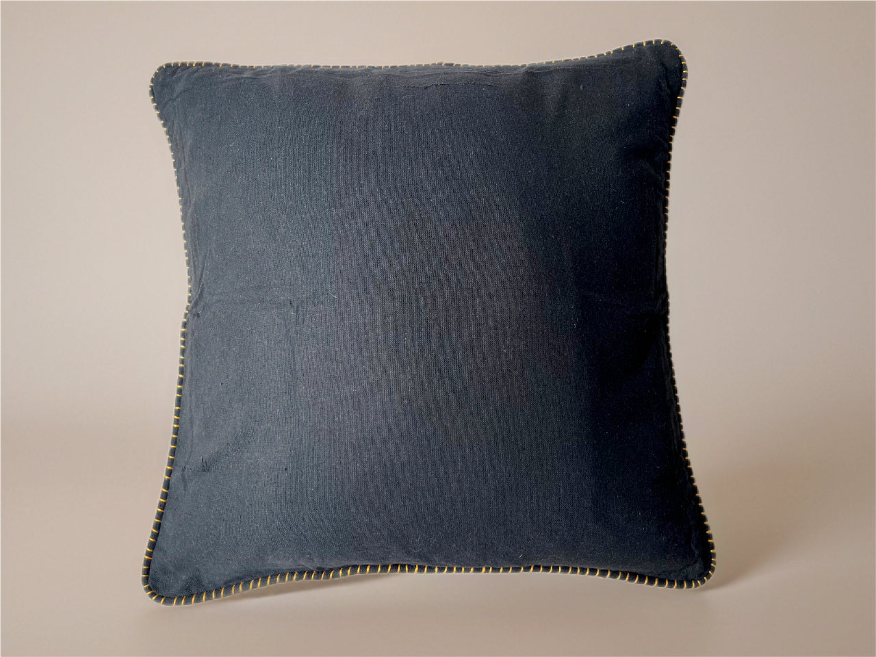 Handcrafted in cotton, this black cushion cover is accented with fine yellow threadwork along its edges — a subtle detail that catches the eye without breaking the calm. Designed to ground a space in quiet contrast, adding warmth, texture, and effortless refinement.