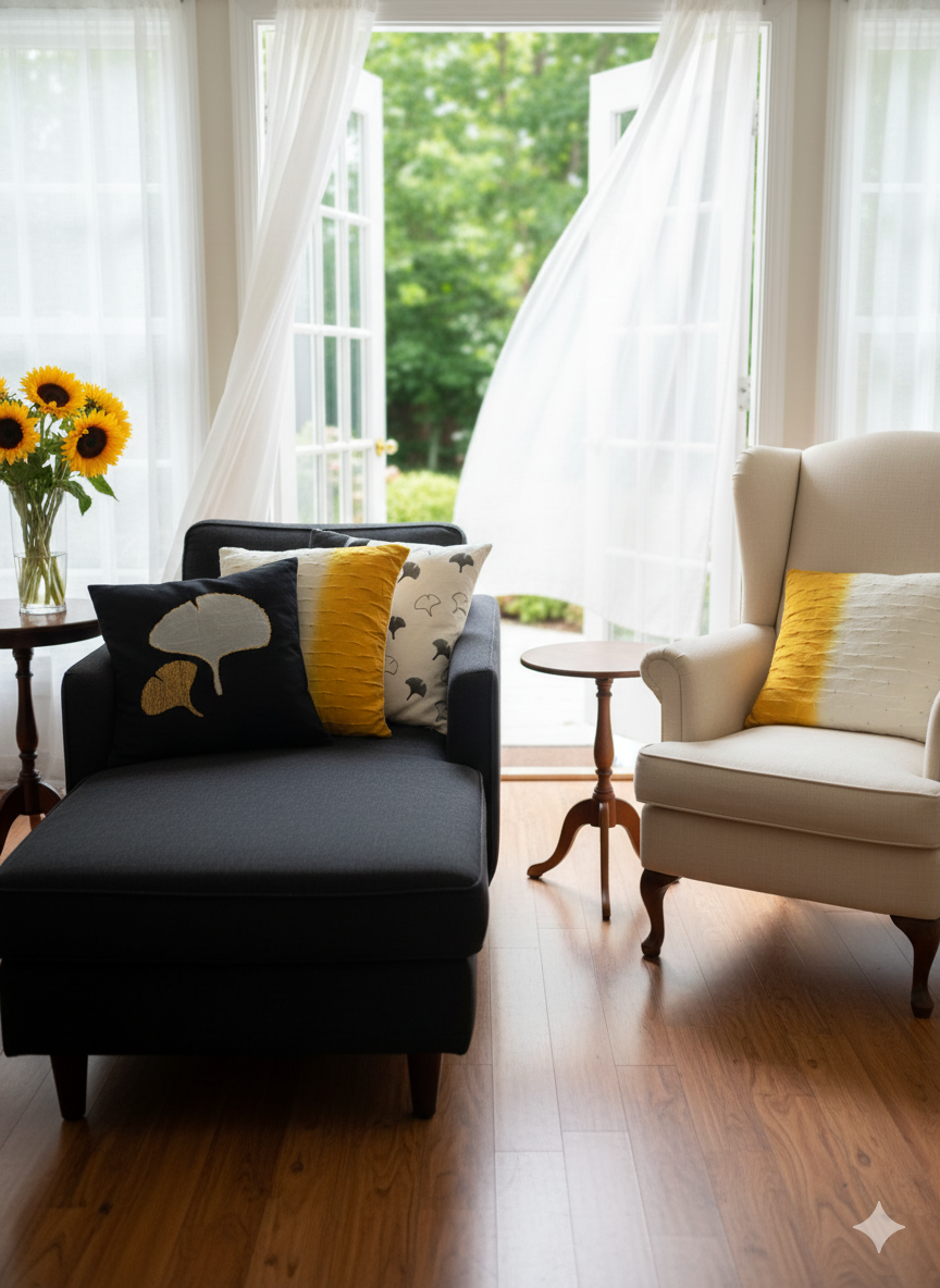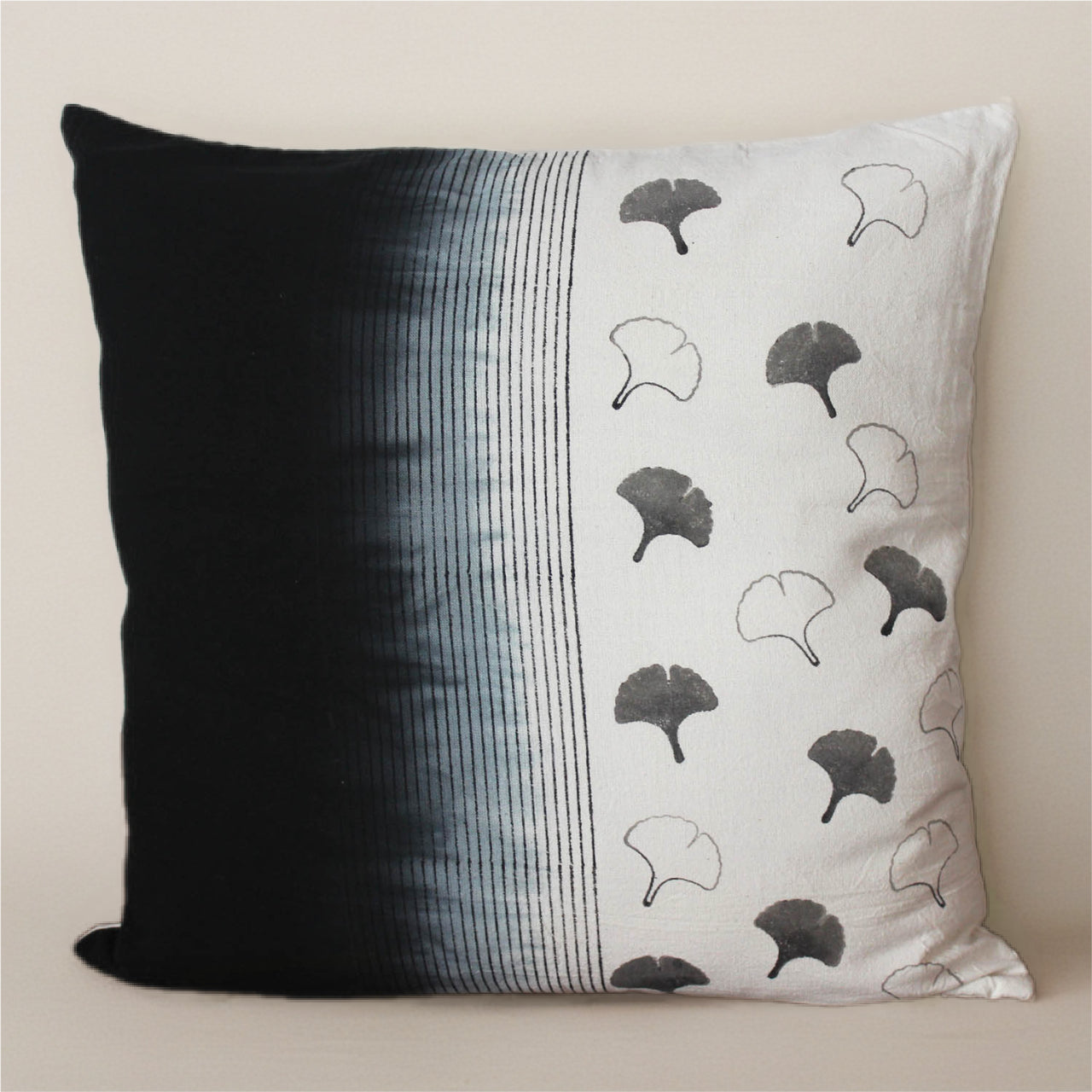 In bold black and white, this cotton cushion cover layers block-printed blooms with ombré gradients. Designed to make a graphic statement, it transforms any space with contrast, clarity, and contemporary edge.