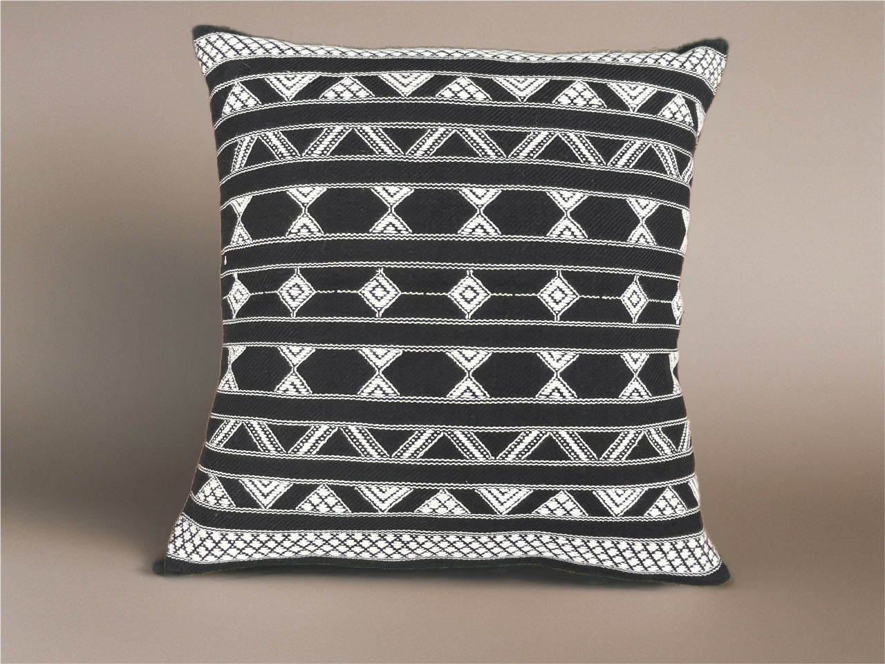Handwoven in 100% cotton, this cushion cover features intricate geometric motifs rendered in classic black and white. The tactile weave and graphic symmetry create a refined statement piece, designed to anchor a room with contrast, structure, and effortless style.