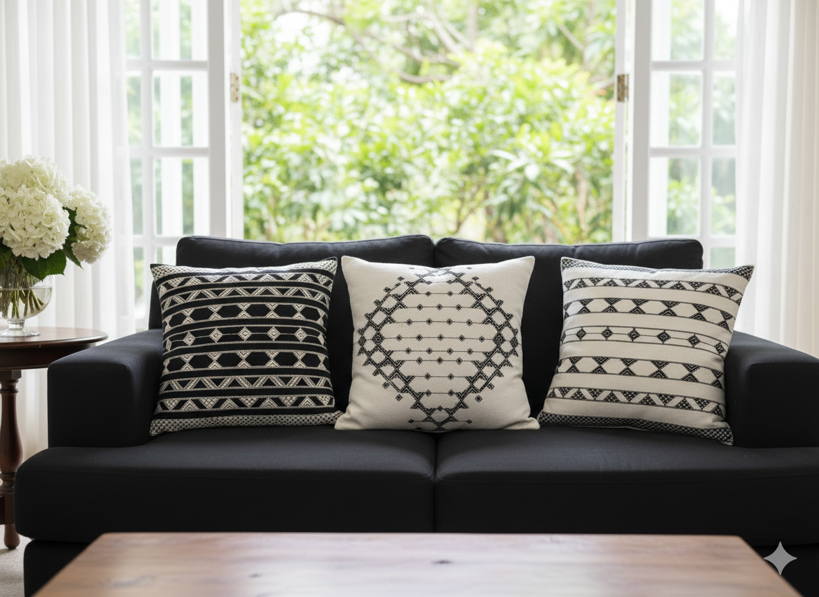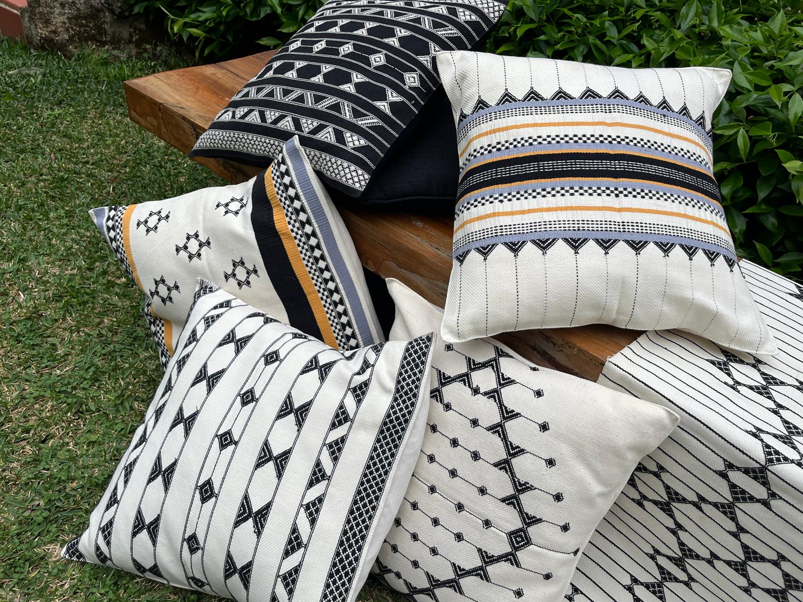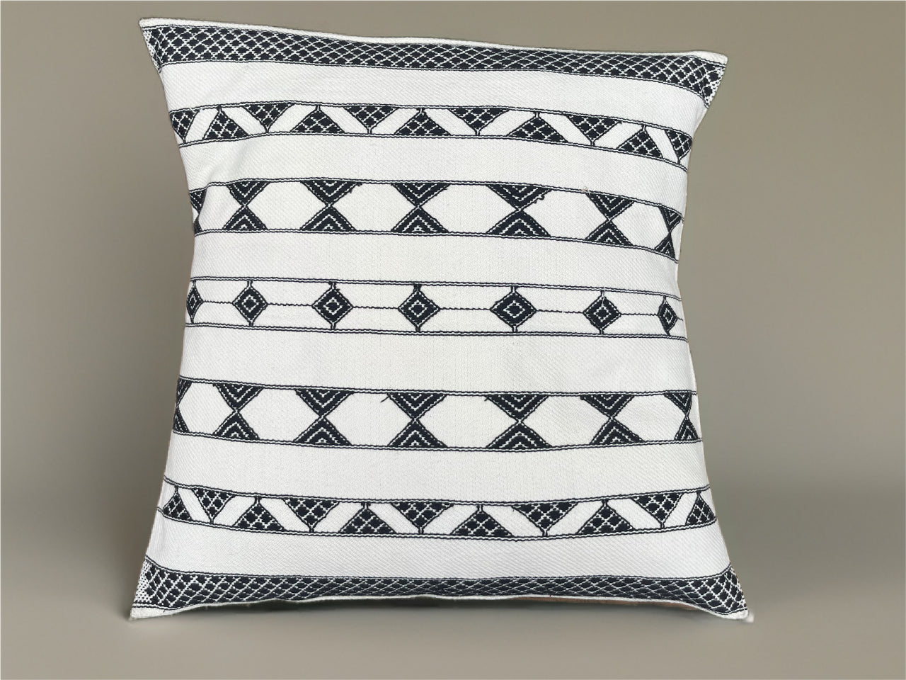 Handwoven in 100% cotton, this cushion cover features intricate geometric motifs rendered in classic black and white. The tactile weave and graphic symmetry create a refined statement piece, designed to anchor a room with contrast, structure, and effortless style.