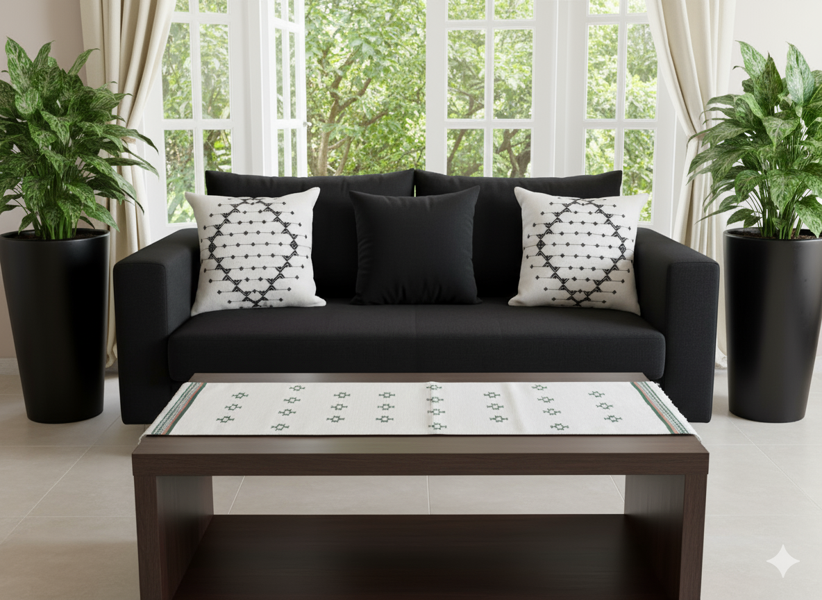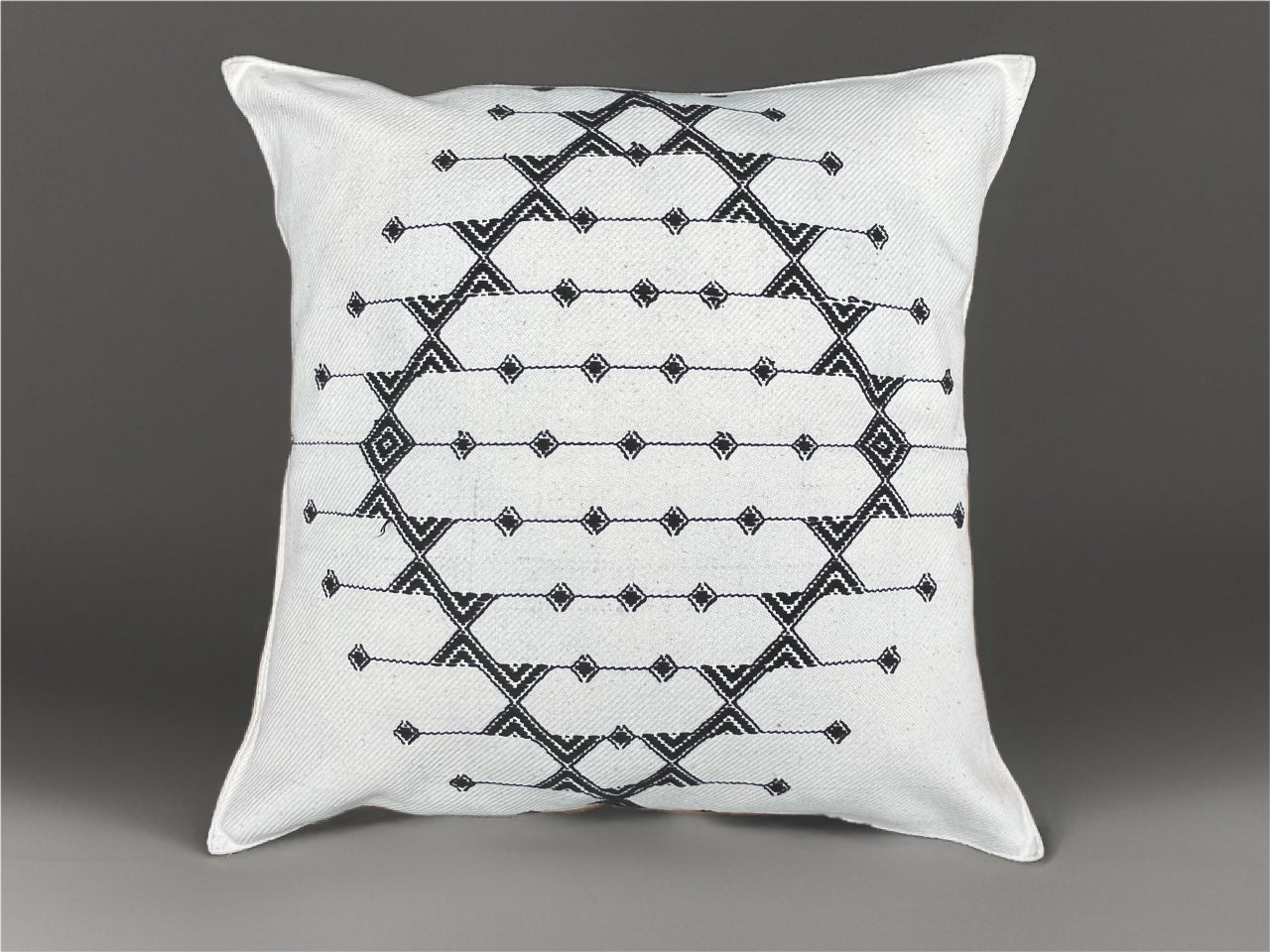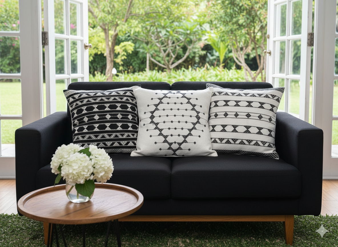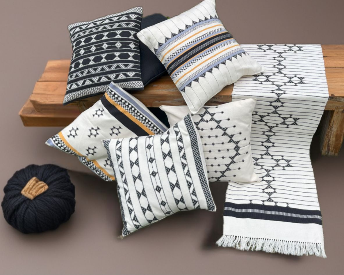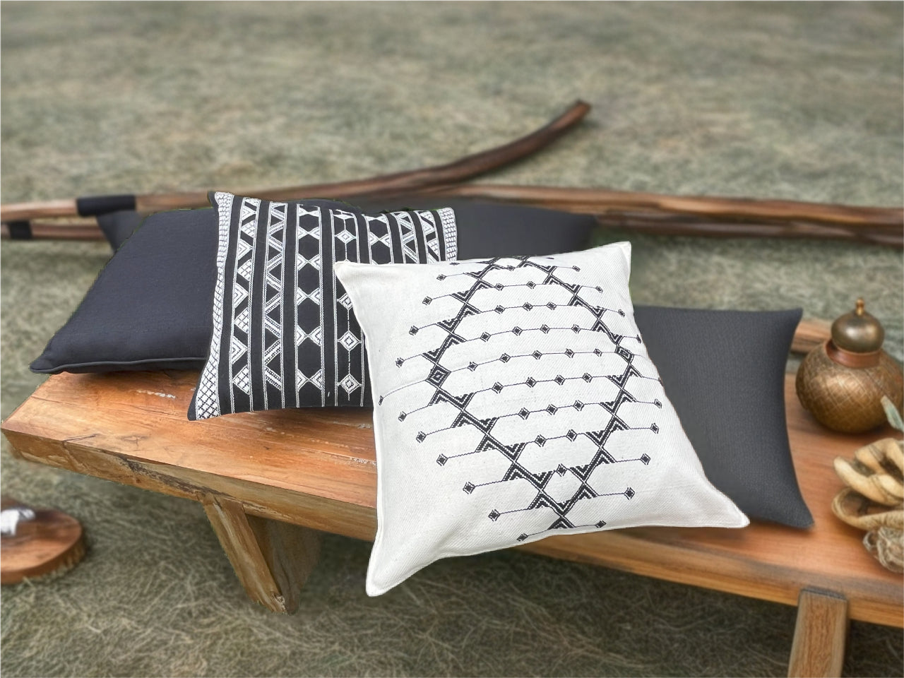 Handwoven in 100% cotton, this cushion cover features intricate geometric motifs rendered in classic black and white. The tactile weave and graphic symmetry create a refined statement piece — designed to anchor a room with contrast, structure, and effortless style.