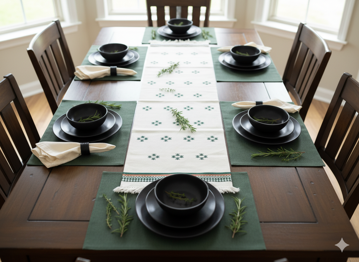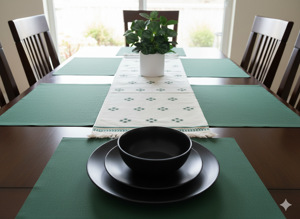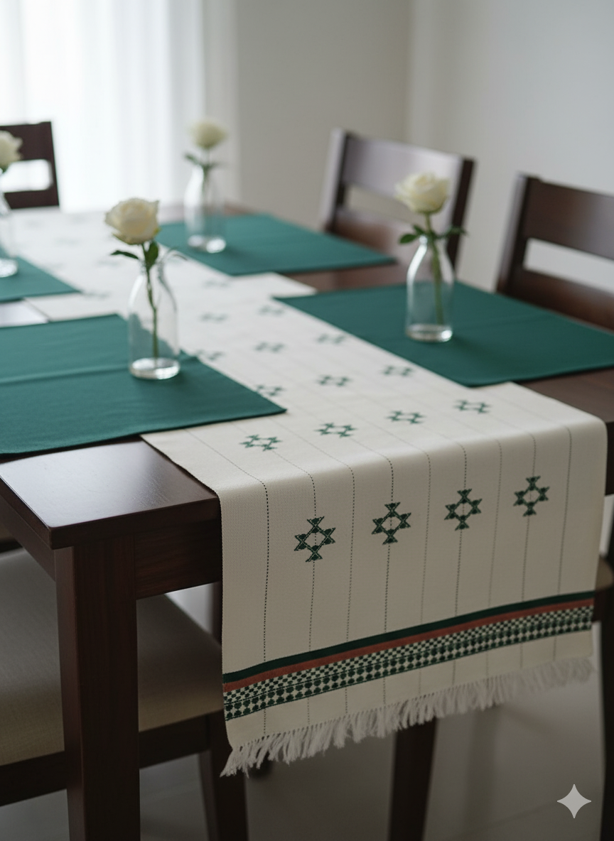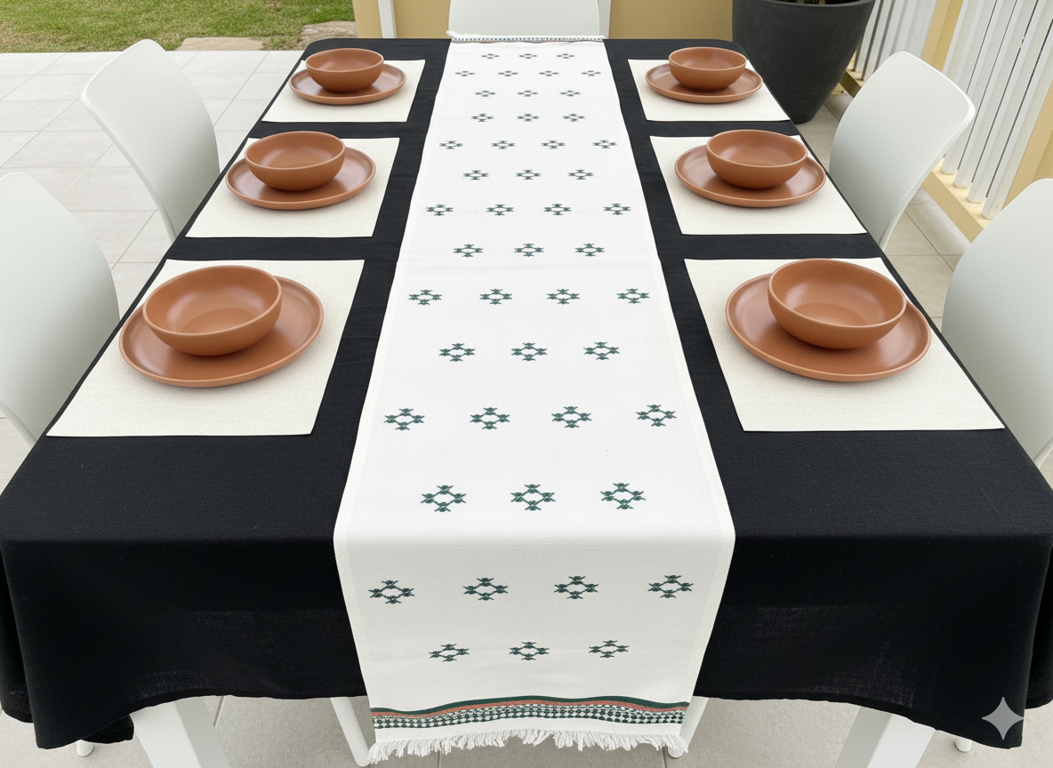 Handwoven in 100% cotton, the Orbit runner features linear black patterns on a soft ivory base, finished with deep green and rust motifs and subtle fringed edges. Designed to bring definition and visual rhythm to dining or coffee tables, it pairs effortlessly with the Sitara cushions to create a cohesive, contemporary setting.