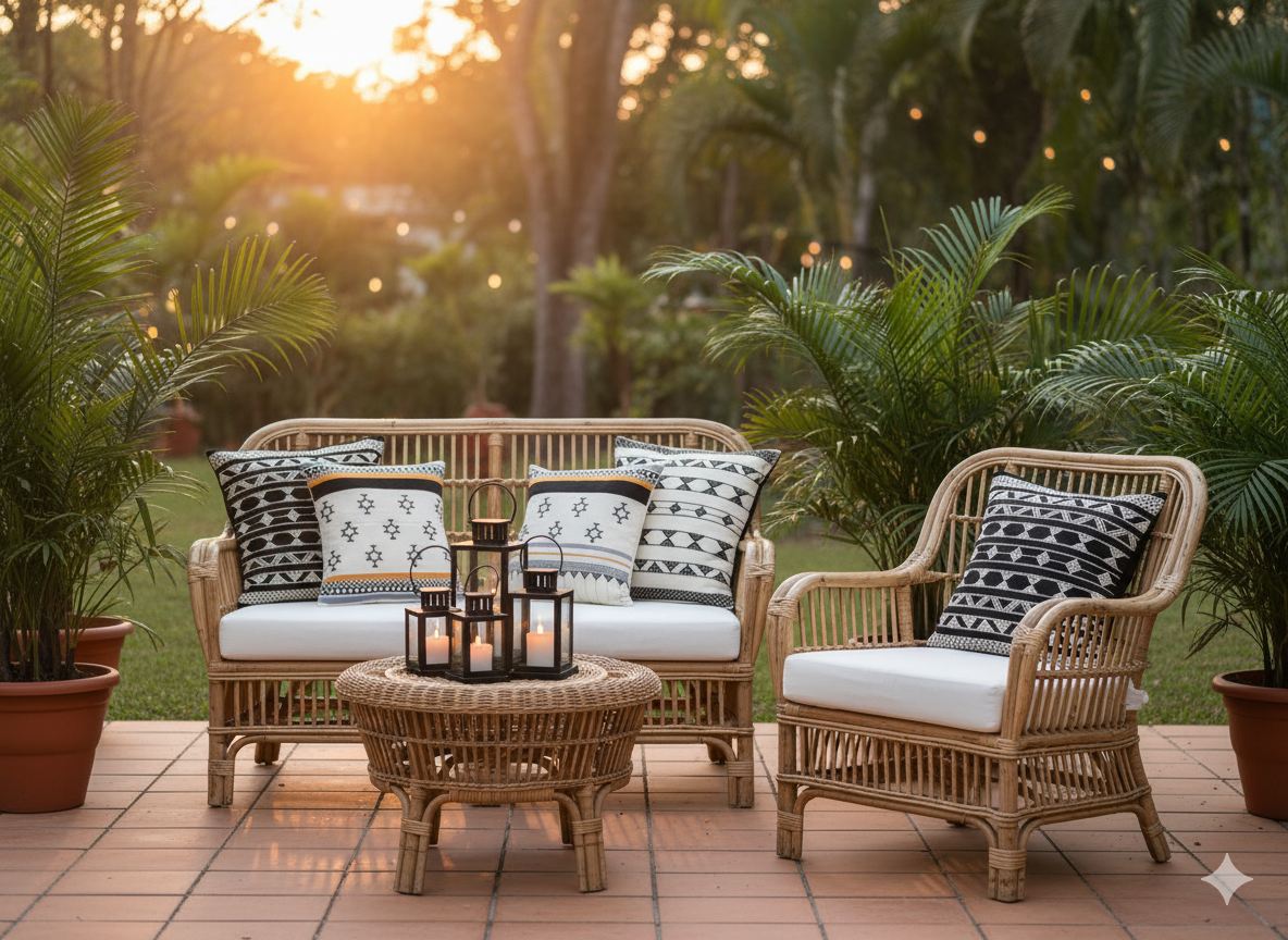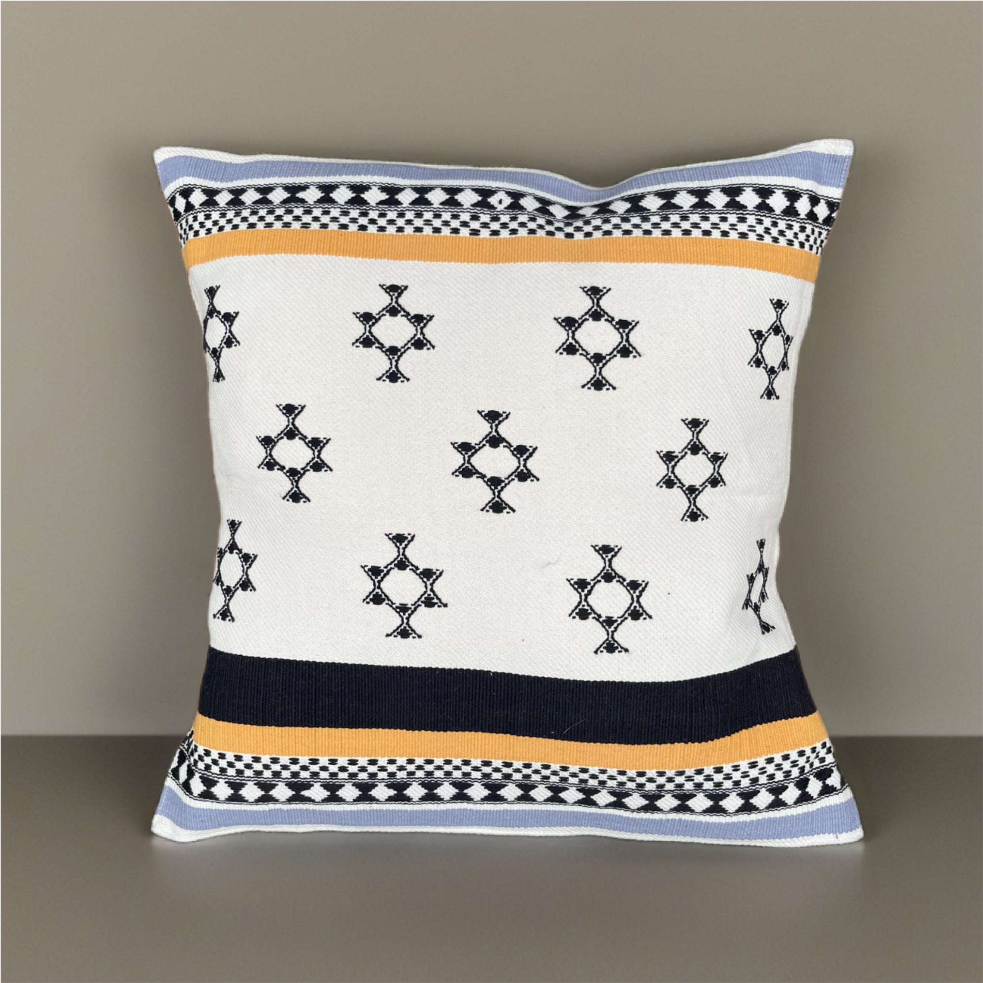 Crafted in handwoven cotton, this cushion cover layers bold black, white, and ochre stripes in a graphic rhythm softened by pale blue-grey. Designed to ground a space in warmth and balance, where structure meets subtle color.