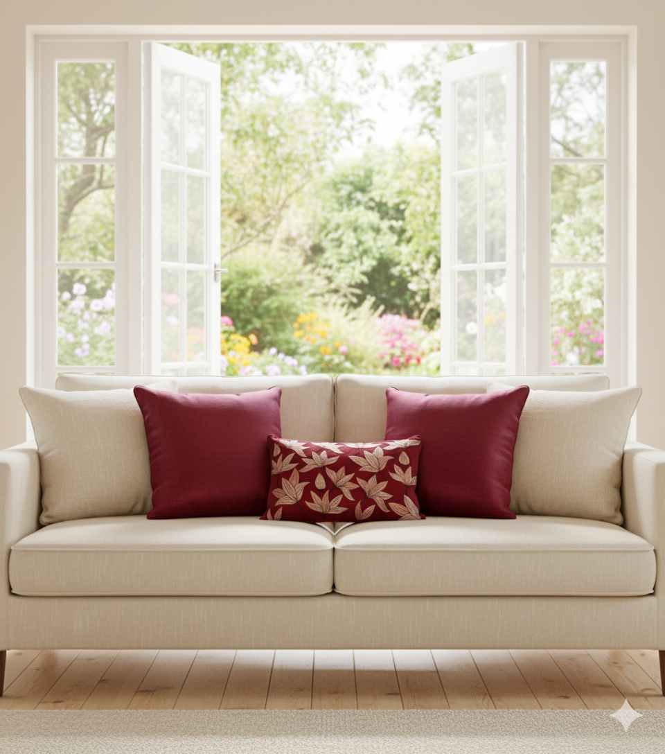 Woven in lustrous Dupioni Silk, this maroon cushion cover brings quiet drama to modern living through the subtle beauty of embroidered florals. Designed to bring depth and softness to your space, it carries the natural sheen and tonal variations that make silk endlessly captivating.